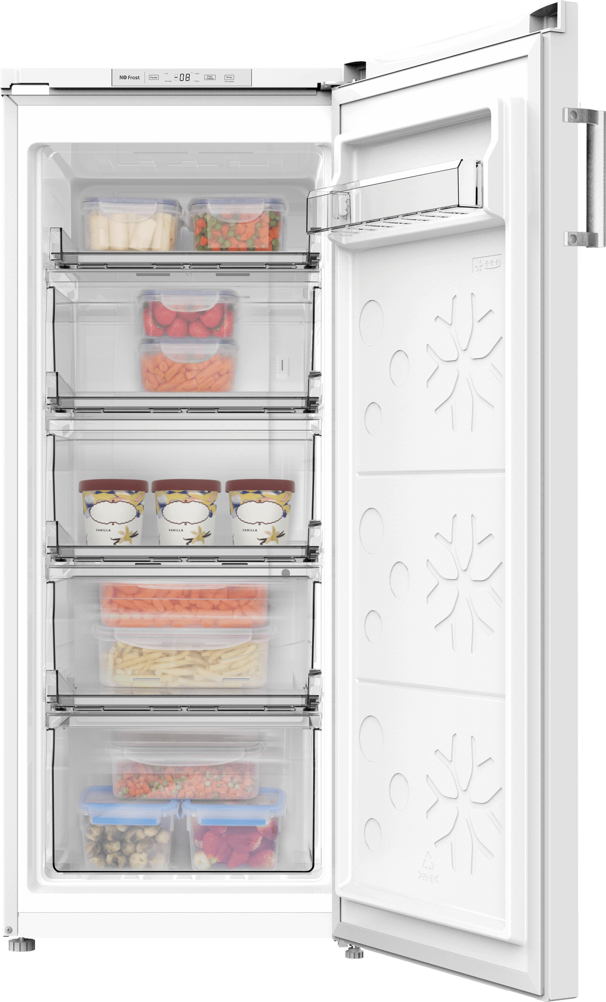 Marke: FORS, Gefrierschrank freistehend FORS, No Frost, Stand/Einbau: Standgerät, Farbe: Weiss, Türtyp: Türe weiss; Volltür, Türanschlag: Rechts wechselbar, Klimaklasse: SN-T, Jahresverbrauch Energie: 193 kWh, Geräuschwert: 39 dB(A) re 1 pW, Geräuschemissionsklasse: C, Steuerung: hinter der Tür; Tasten-Elektronik, Display: digital; LC-Display monochrom, Gefrierleistung: 5 kg/24h, Fastfreeze: zeitgesteuert, Ice Maker: Nein, Nutzinhalt Gesamt: 122 l, Nutzinhalt Gefrieren: 122 l