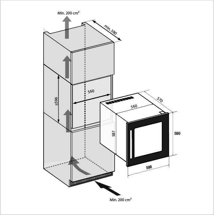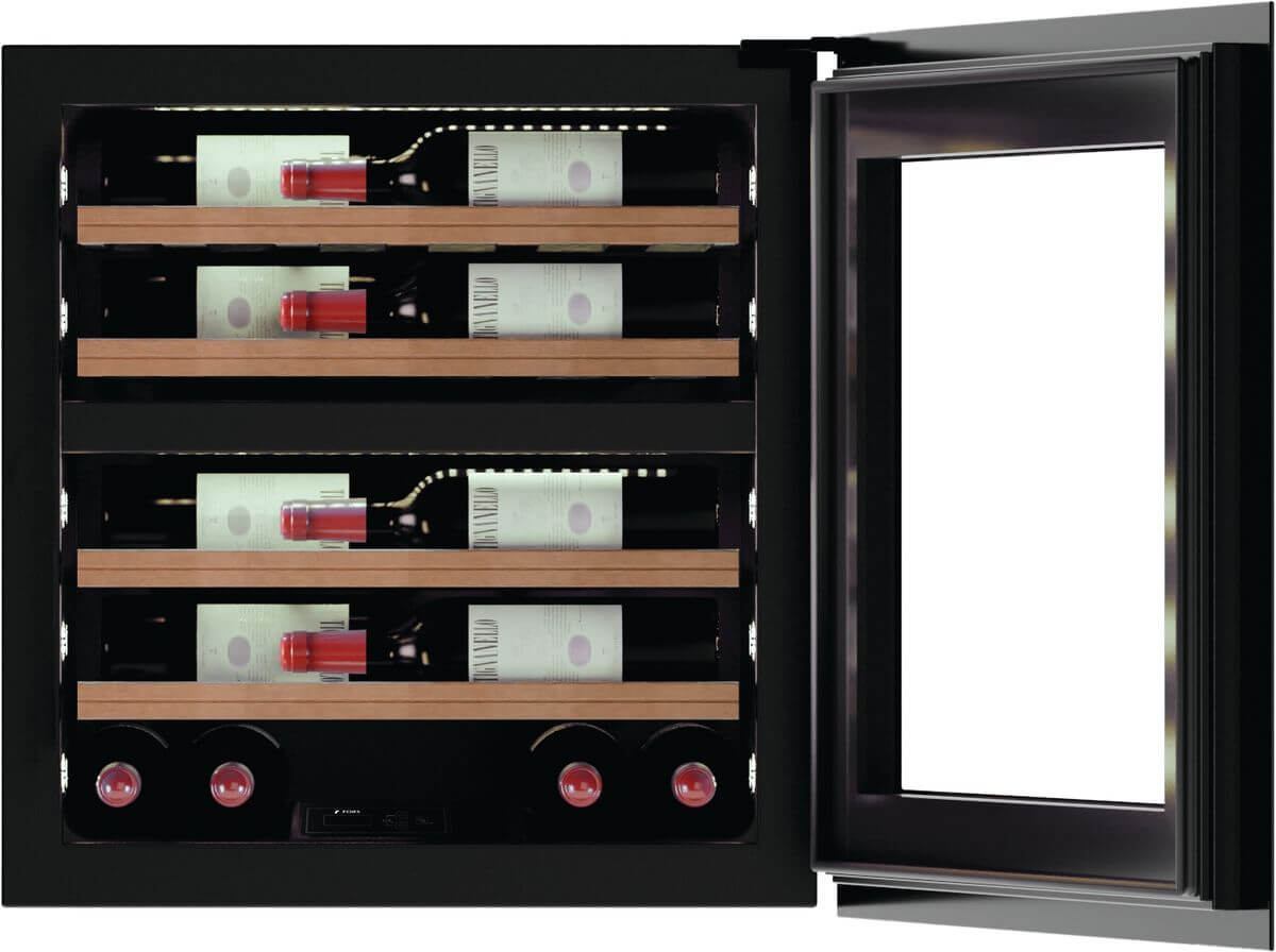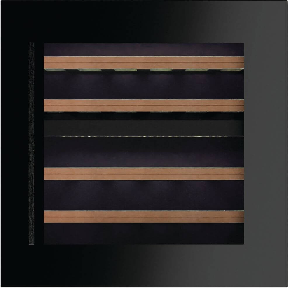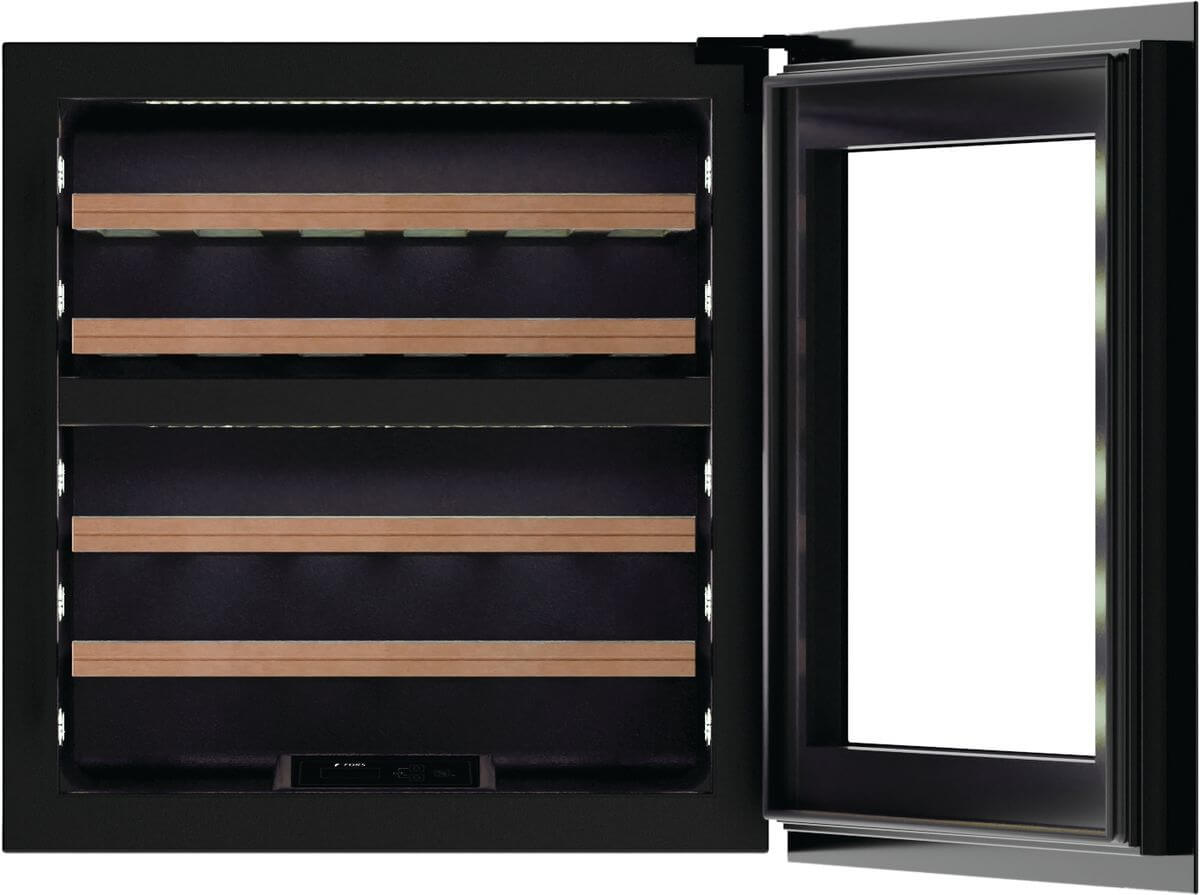 Marke: FORS, Weinkühlschrank Einbau FORS EXCLUSIVE, Stand/Einbau: Einbaugerät, Farbe: Schwarz, Türtyp: Isolierglastür; Rahmen schwarz; Soft-Close, Einbauart: Einbau, Türanschlag: Rechts wechselbar, Klimaklasse: SN-T, Breitennorm: 60 cm, Nischenhöhe: EURO 600 mm, Jahresverbrauch Energie: 150 kWh, Geräuschwert: 38 dB(A) re 1 pW, Geräuschemissionsklasse: C, Steuerung: hinter der Tür; Touch-Elektronik, Display: digital; LC-Display monochrom, Kühlsystem Weinteil: dynamisch, Umluft, Temperaturbereich Weinteil: 5 °C – 20 °C, Anzahl Klimazonen: 2, Anzahl Ablagen: 5, Aktivkohlefilter, Nutzinhalt Gesamt: 69 l, Anzahl Weinflaschen: 26, Beleuchtung: Ja; LED-Deckenbeleuchtung pro Zone und LED-Seitenbeleuchtung beidseitig pro Holzbord in kaltweiss; warmweiss und hellblau (umschaltbar)